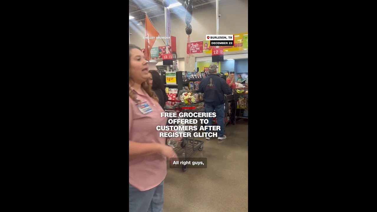 Video taken at an H-E-B grocery store in Burleson, Texas, shows a store employee offering free groceries to customers after she said there were technical problems with the registers. #cnn #news #heb #texas #christmas