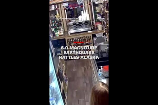 Surveillance footage shows the moment that an earthquake hit a coffee shop in Anchorage, shaking syrup off the shelves as