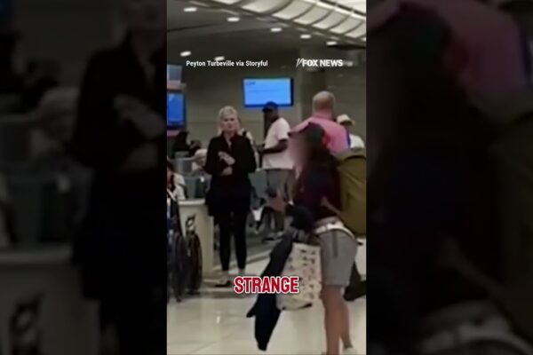 A woman’s explicit airport meltdown was caught on camera as she kicked an employee and damaged computer equipment before being